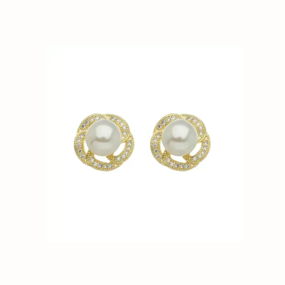 Um brinco em forma de flor, cravejado em micro zircônias e adornado em pérolas shell. Um primôr de peça banhada a ouro. Tudo que você precisa no seu porta jóias.